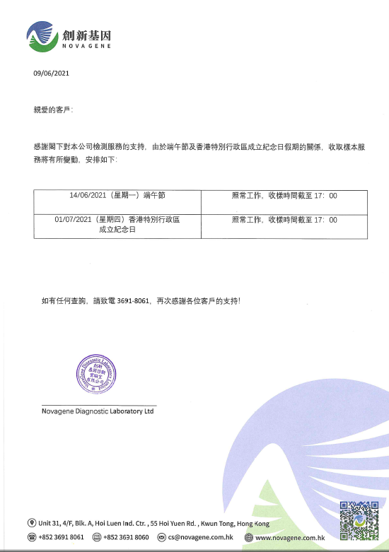 關於2021年端午節i及香港特別行政區成立紀念日假期收樣服務變動的通知