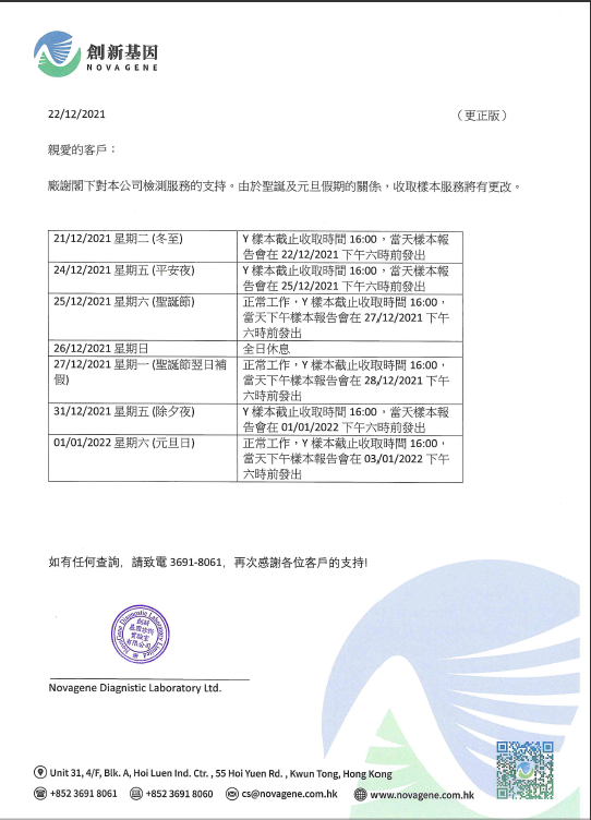 關於2022農曆新年放假及收樣服務變動的通知